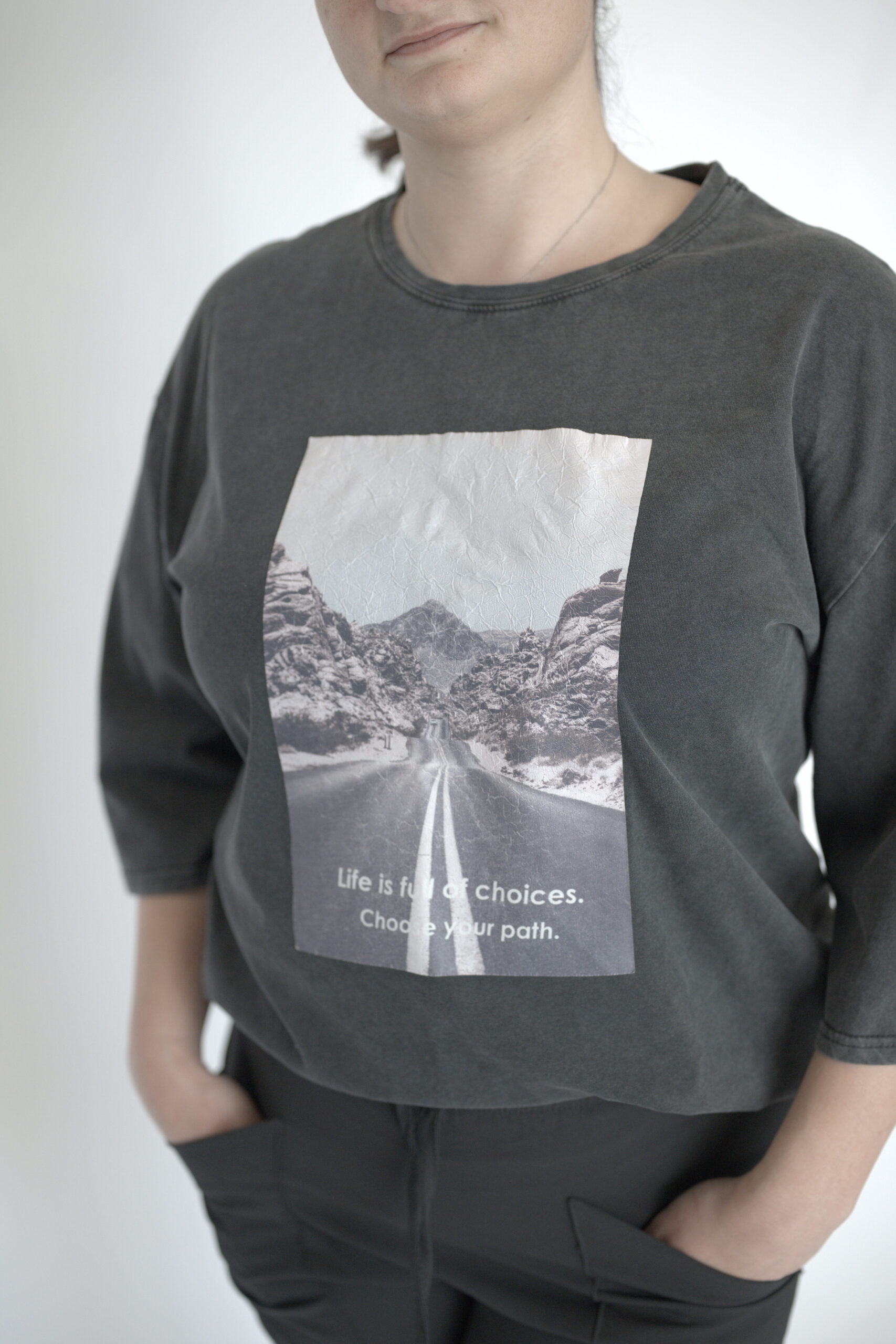 טישרט אפורה/שחורה מכסה מרפק של c.style לא רשומה מידה תתאים לדעתי ל M/L/XL – תלוי כמה צמוד/ אוברסייז תעדיפי