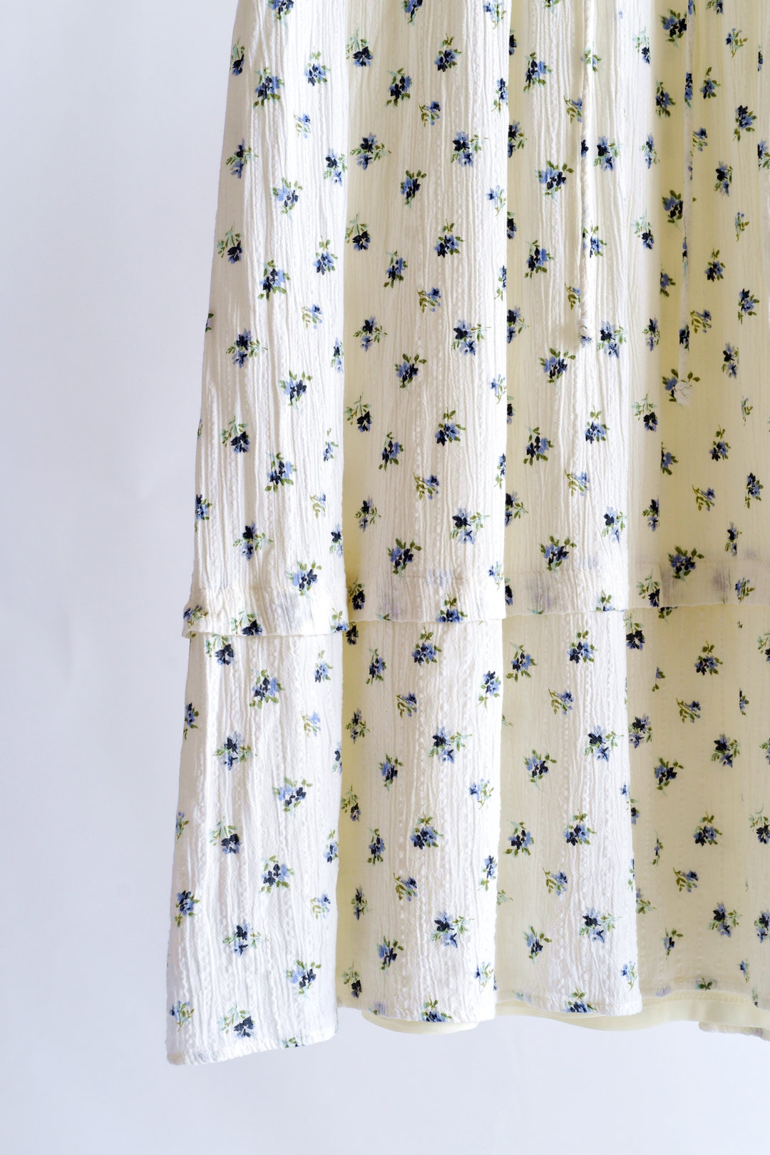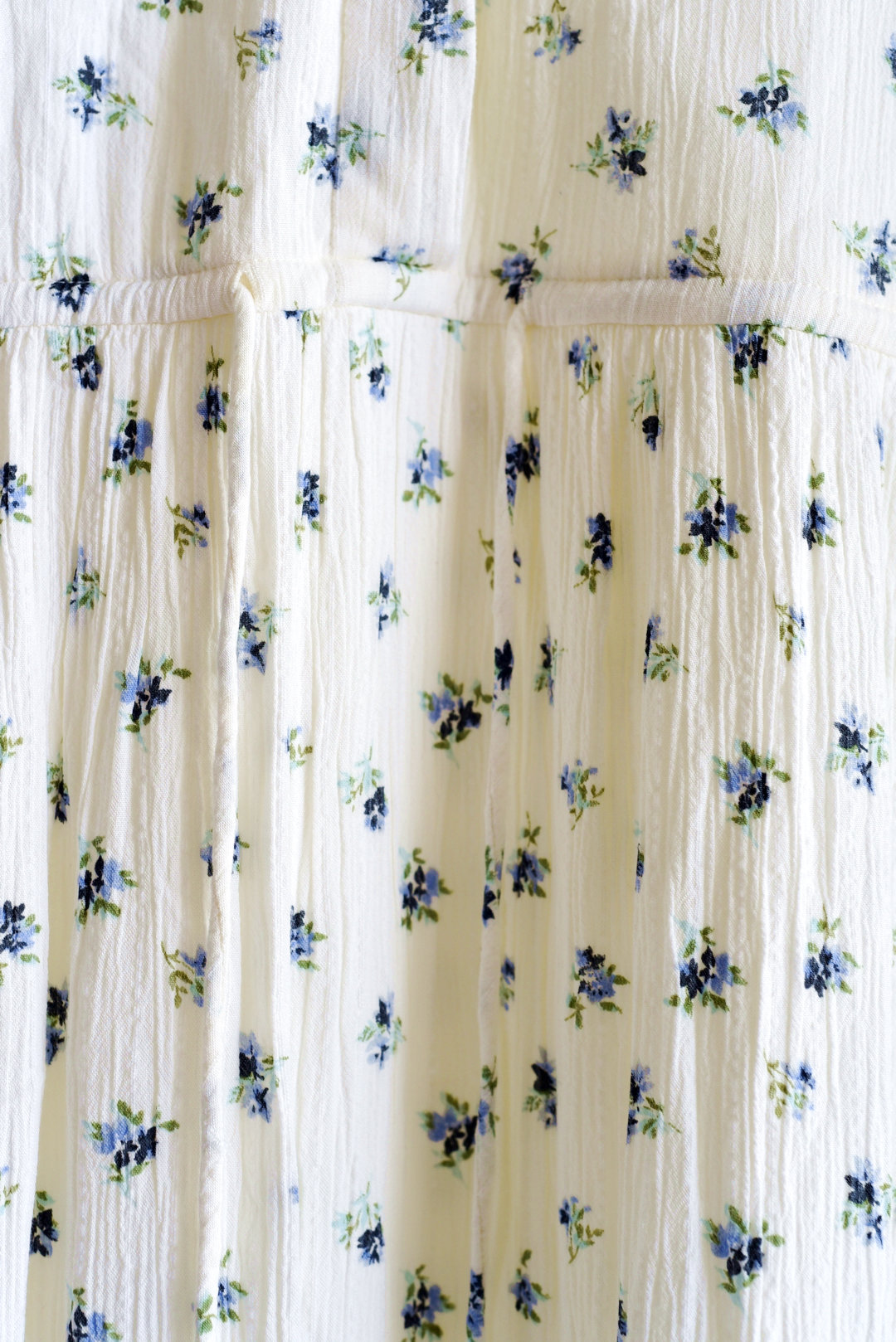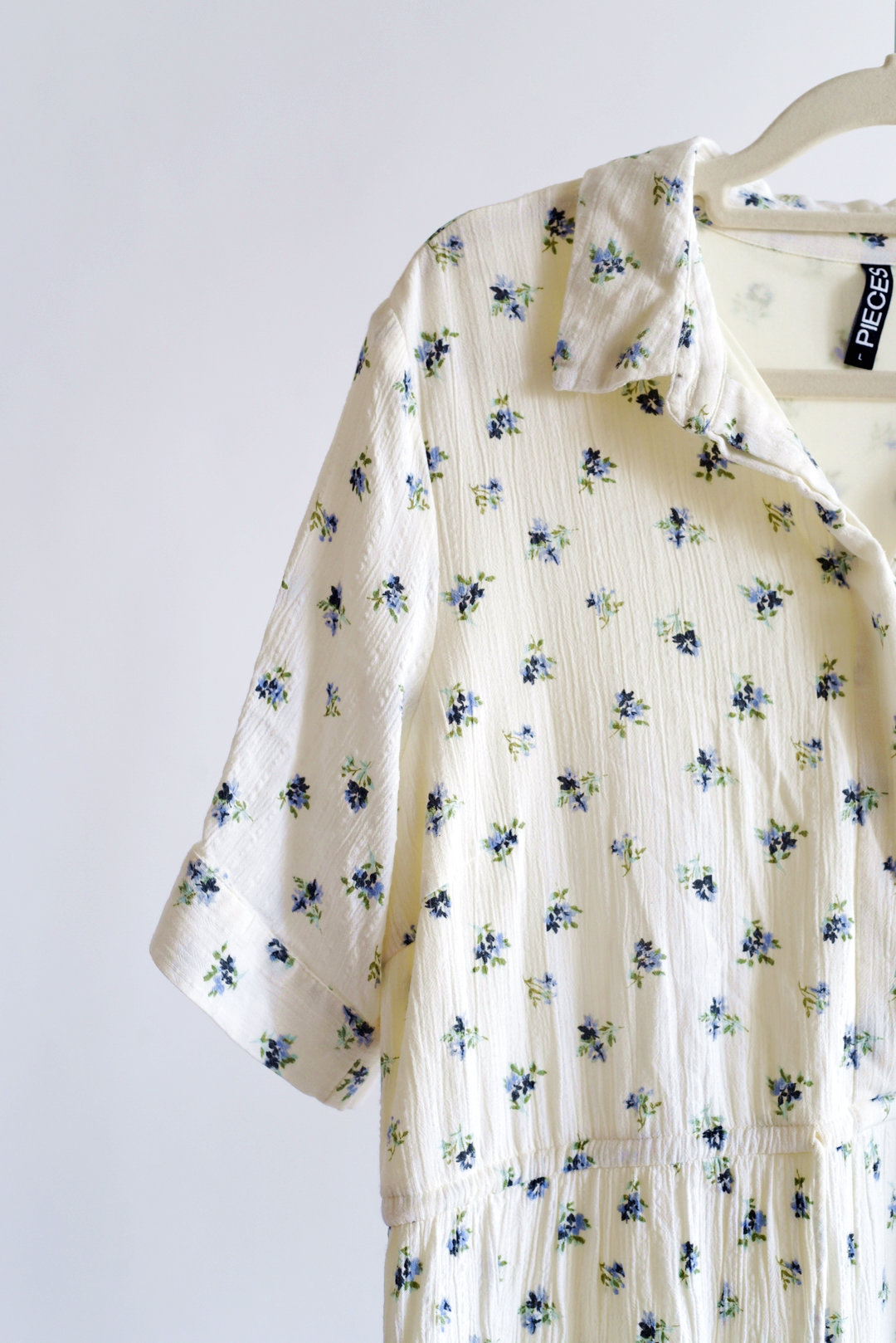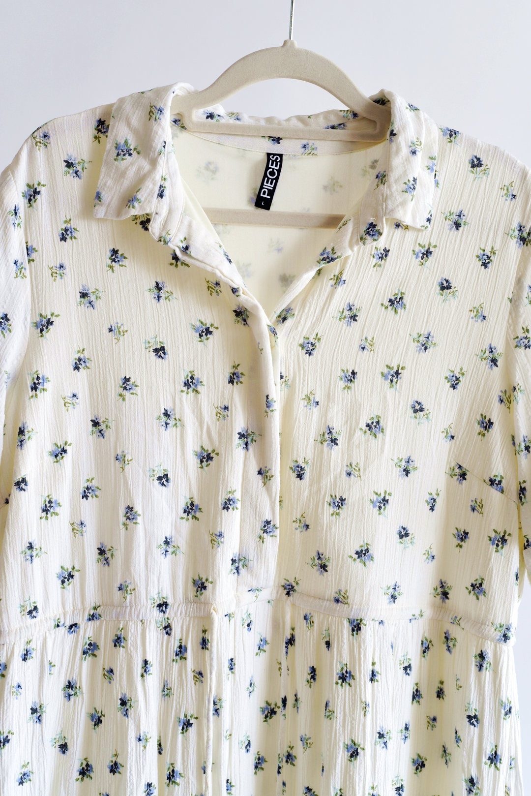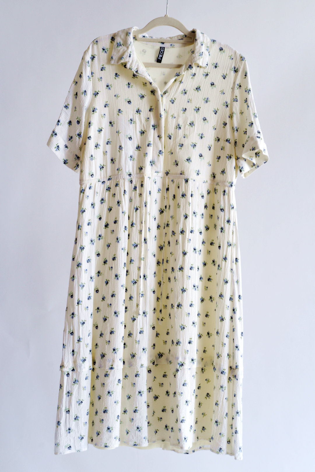 שמלה לבנה פרחונית 100% ויסקוזה עם תחתית והארכה למטה אורך כולל 100 סמ מידה רשומה L