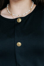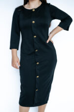 שמלה שחורה של שירלי אוסדון עם כפתורים זהובים. מידה רשומה 2 אבל תתאים מאד גם ל1בגלל הגזרה הצמודה.
