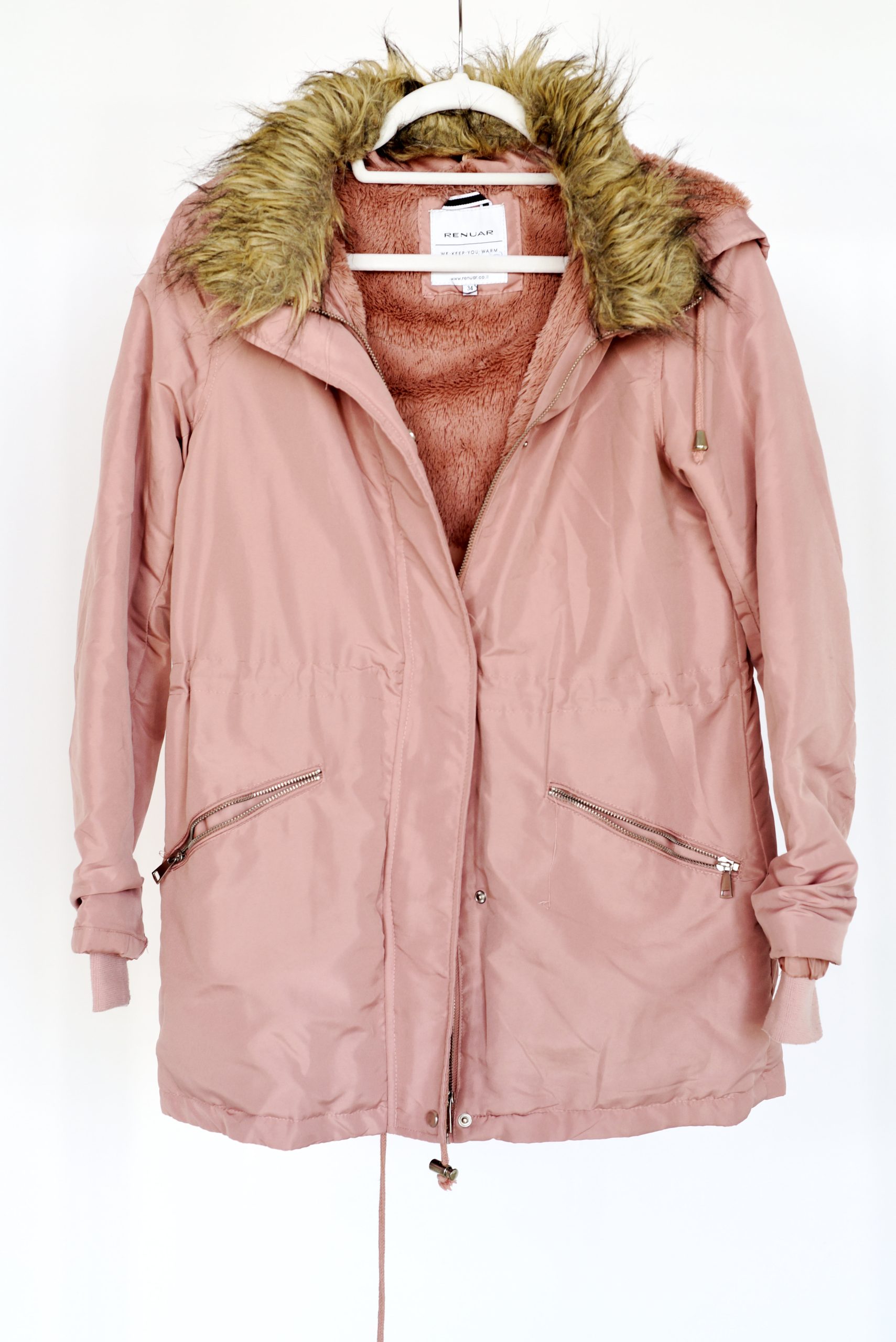 מעיל ורוד של רנואר מידה רשומה 34 אבל לחלוטין מתאים לS וגם ל M בגזרה צמודה (חלק קטן מהפרווה השתחרר וצריך להדביק/לתפור)