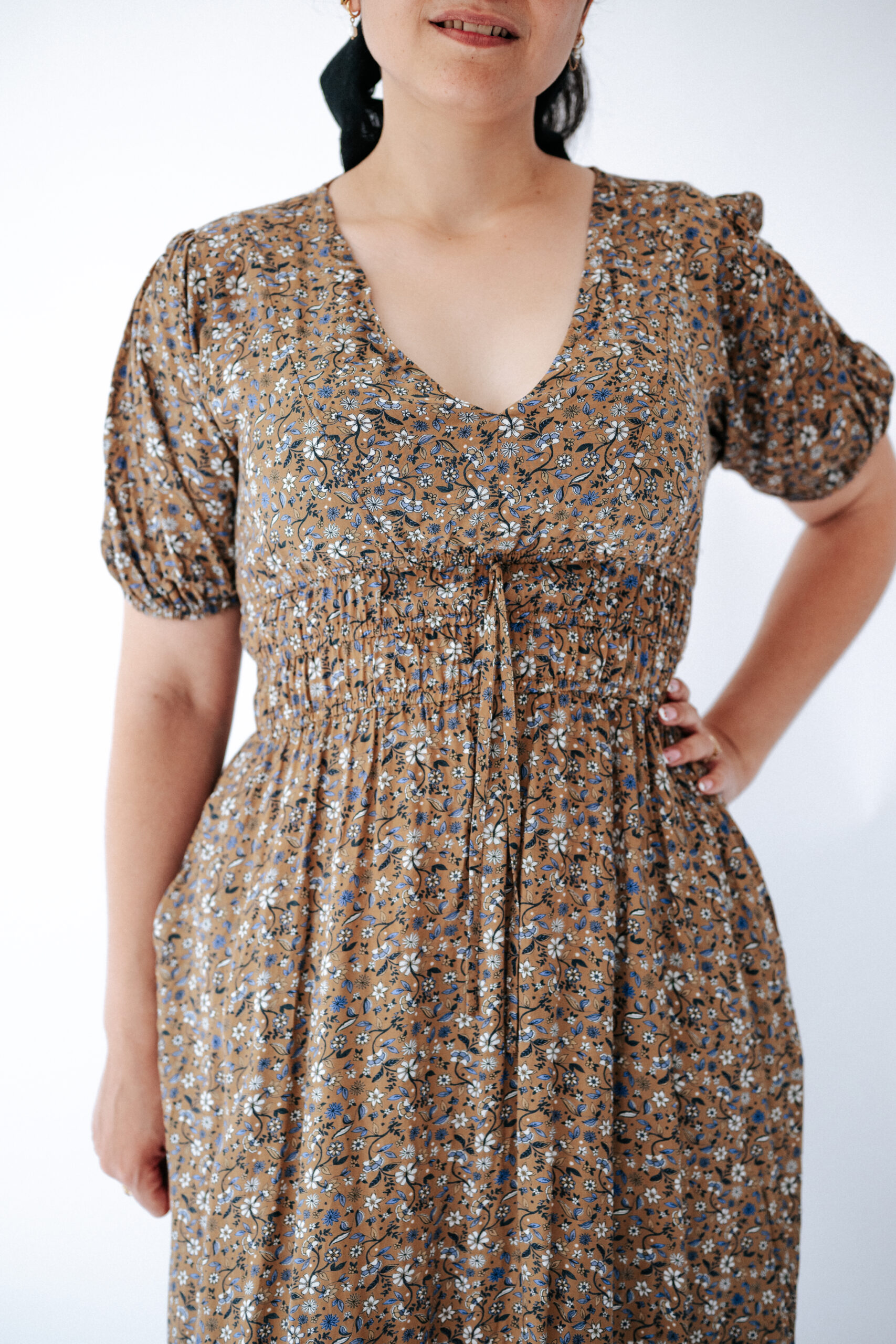 שמלה 100% ויסקוזה בצבע חום חרדל עם פרחים של קסטרו מידה רשומה 42 תתאים גם לפחות