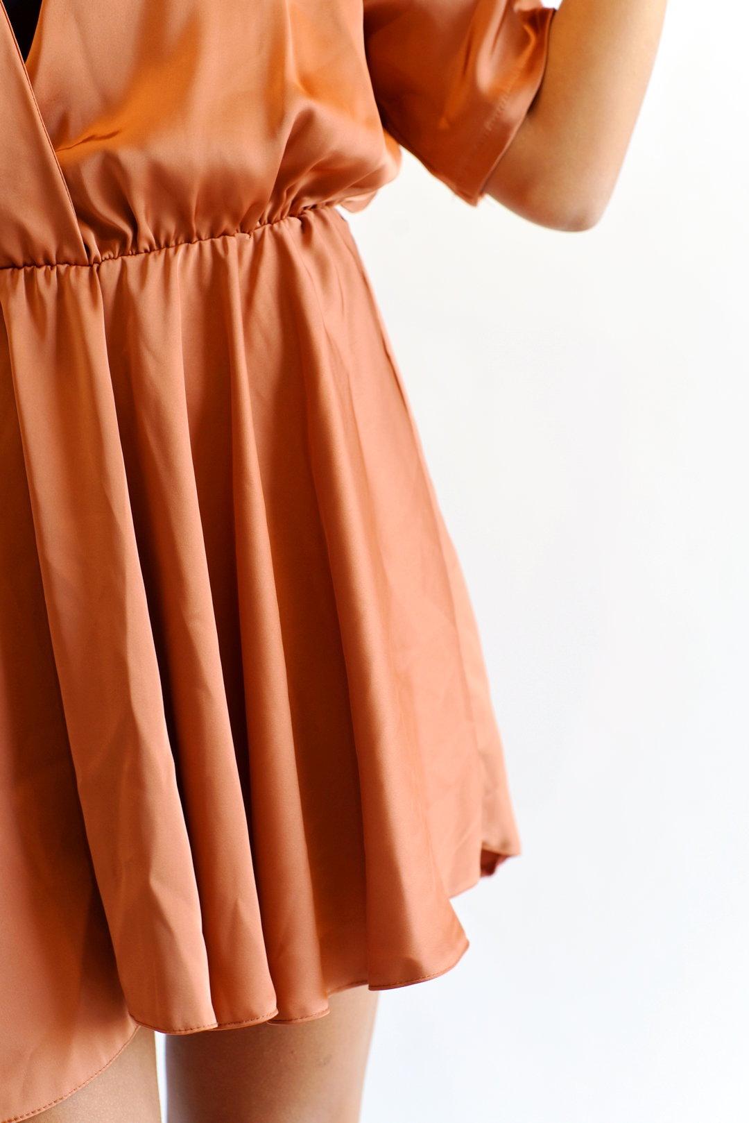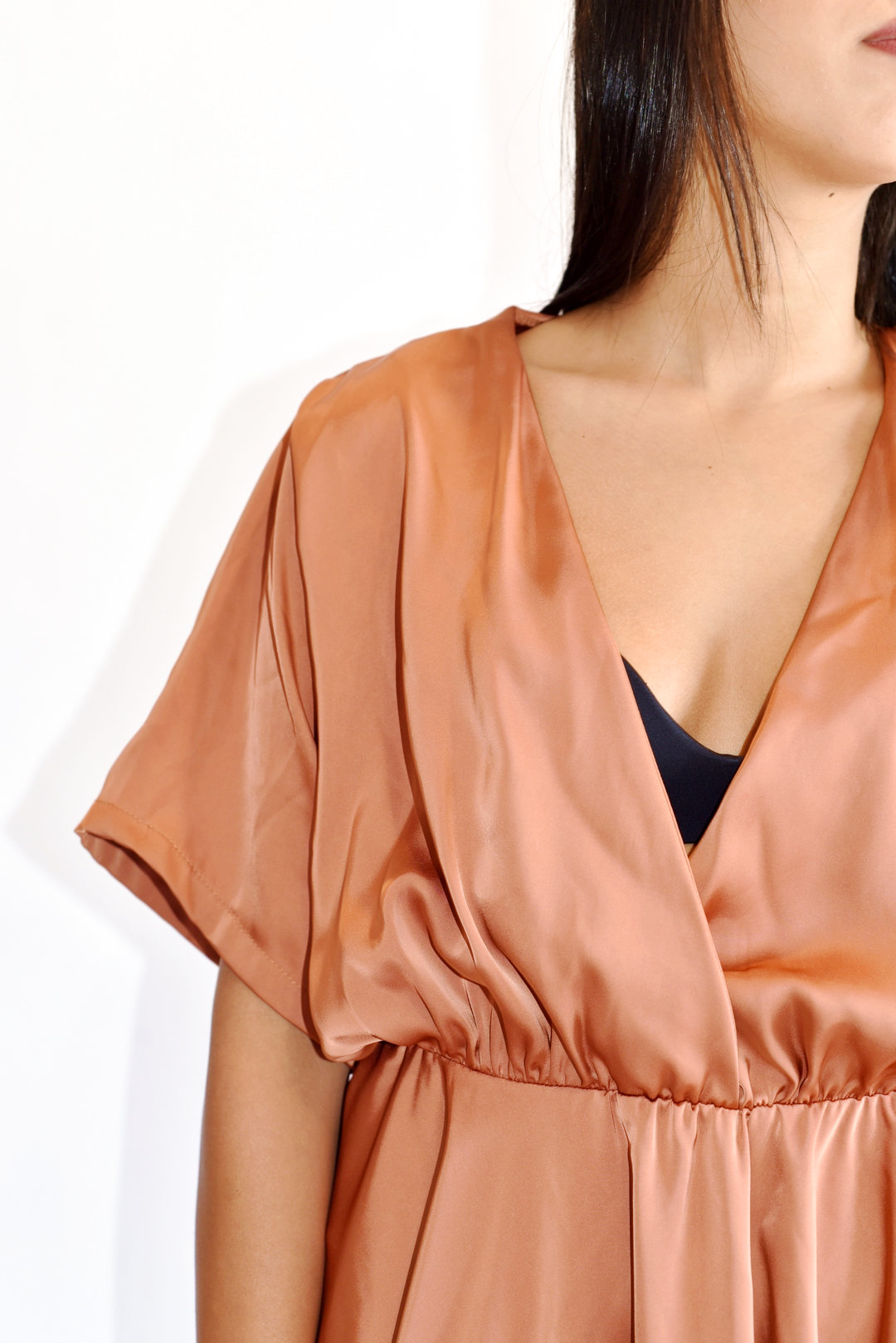 שמלה של NATALY בסגנון סאטן אין מידה נראה שתאים לL עם מחשוף עמוק אורך 88 סמ מגיעה עם ספוגיות בכתפיים