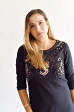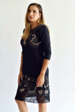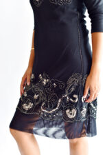 שמלה שחורה של שדה בר עם עיטורים מידה רשומה S תתאים גם לM. מגיעה עם תוספת בד למטה שאפשר לפרום. אורך כולל תוספת 99 סמ וללא תוספת 89 סמ.